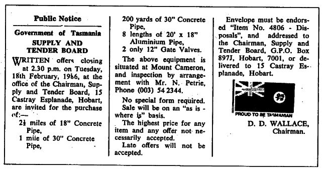 The Director of Mines, Hugh Murchie who was chairman of the Mt. Cameron Water Race Authority, said tome, 'If you buy the valves from the dam and the pipes out of the syphons (it would have been really an act of vandalism to dismantle this enormous syphon of two and a half miles in length) the water scheme will belong to you, and land my Government would be pleased to see it used again instead of being scrapped, for it had been operating for 100 years and is one of the biggest schemes of its kind, if not the biggest, in Australia.'