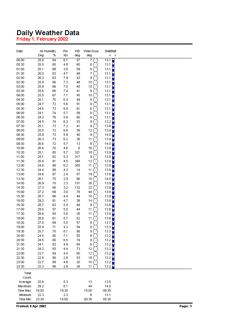 Weather data at 30 minute intervals. The circular symbol is a wind rose, and the gauge shows logger battery voltage