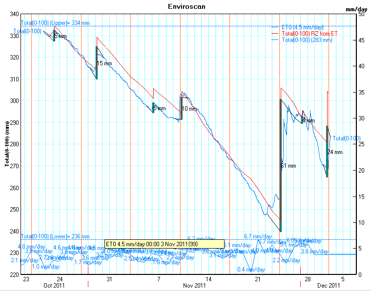 The top blue line is total water content in the profile calculated from soil moisture sensors at different depths.
