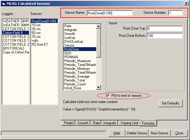 Use , select the calculated RootZone sensor, and on the tab 'Plot to end of season'.