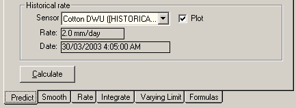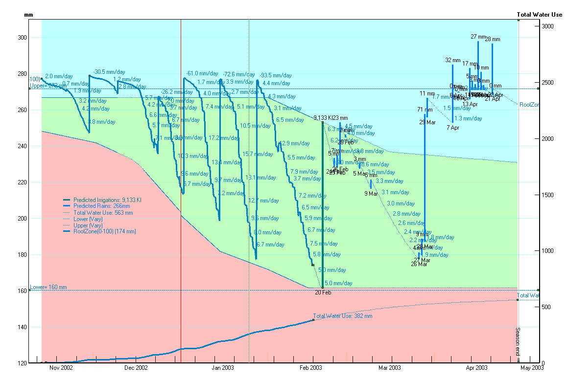 Scheduling can start from last RZ calculated from ETTotal, or a user set RZ1 using drag/drop. Only one prediction line can be plotted at a time: calculated, user or historical. also sets that this et will be used for scheduling Et for remainder od fseason taken from 'historical', of not set from last measured, ig not set from user, if not set = 5 mm/day. the date of next flood irrigation can be 'fixed' drag/drop of user rate for predictions