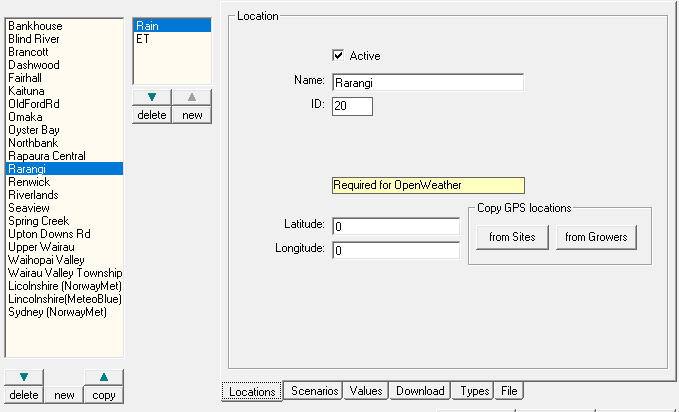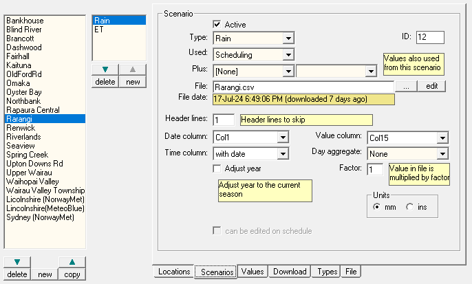 Each location has 'Scenario's - rain, ET, temperrature, etc (scenario is a sill name) Each scenario can get its vale indepdantly from oteh rscenarios in the location Thsi allows ET, fro example, come from a diffrent forcast service thatn 'remperateure It also allow the value sto come from historical wetaherfiels - n