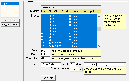 Probe For Windows can use forecast rain and evapotranspiration (ET) when calculating required irrigation, both for the next irrigation and also for the whole season