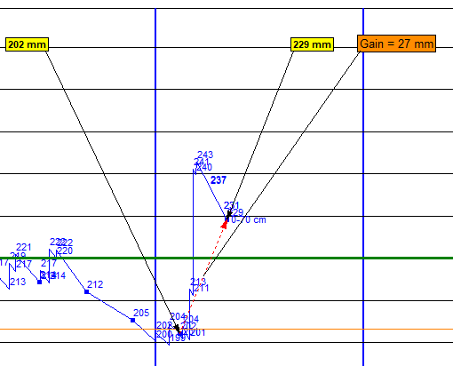 202 mm is last weeks reading, 229 mm is the latest reading, and a red arrow showing net gain