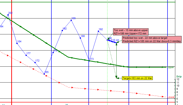 Predicted too wet - 22 mm above target will only be output if the predicted value in 7 days (185 mm on 22 Mar) is above the target value (163mm).