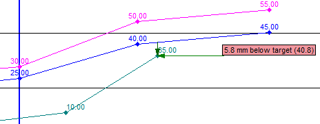 In the example, 5.8mm below target (40.8) is a warning that the last measured value (35.00) is 5.8 mm below the calculated minimum target size of 40.8 mm at that date