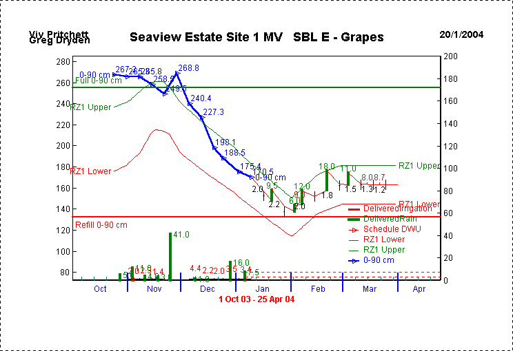 The example above shows a site half-way through the growing season, on 10 January 2005. The thick blue line is the measured soil moisture content, and the upper and lower limit lines are the 'ideal tracking' lines. The grower is trying to stress the grapes using RDI.