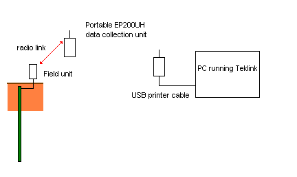 The EP200UH handheld unit is taken close to each field unit and the readings saved to the handheld unit. The handheld unit is then taken back to a PC and a USB printer cable connected so that Teklink can download the readings.
